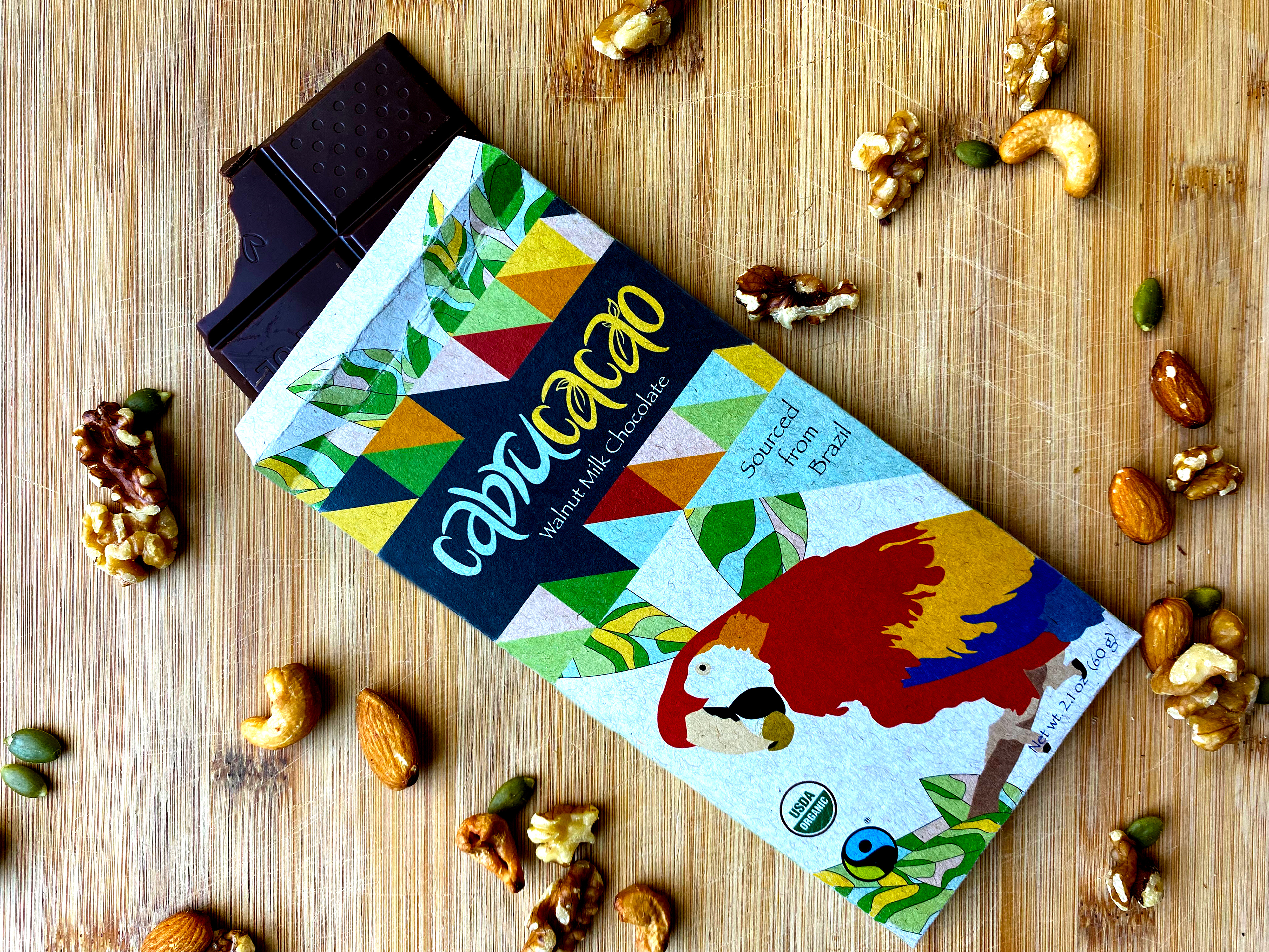 My final design incorporates a combination of foliage, bright and geometric patterns, and native Brazilian birds as the main focal points. While the overall design is very colorful, representative of the colorful Brazilian culture, traditions, and festivals, the layouts are printed on earth-toned, 100% recycled paper. This results in the colors coming out slightly muted, and gives the overall appearance a more natural aesthetic. This helps convey to the consumer that this product is produced with natural, organic ingredients, and that it is not a factory-made, highly processed candy bar. While the colors in the printed design are muted, the combination of cultural colors, patterns, and native animals still remain unique to Brazil, and allow the country of origin to stay recognizable. Each bird is used to represent a different flavor, the ingredient for which they all hold in their beaks. This adds variety between the packaging for each flavor, while the consistent background and logotype ties the variations together under one brand.